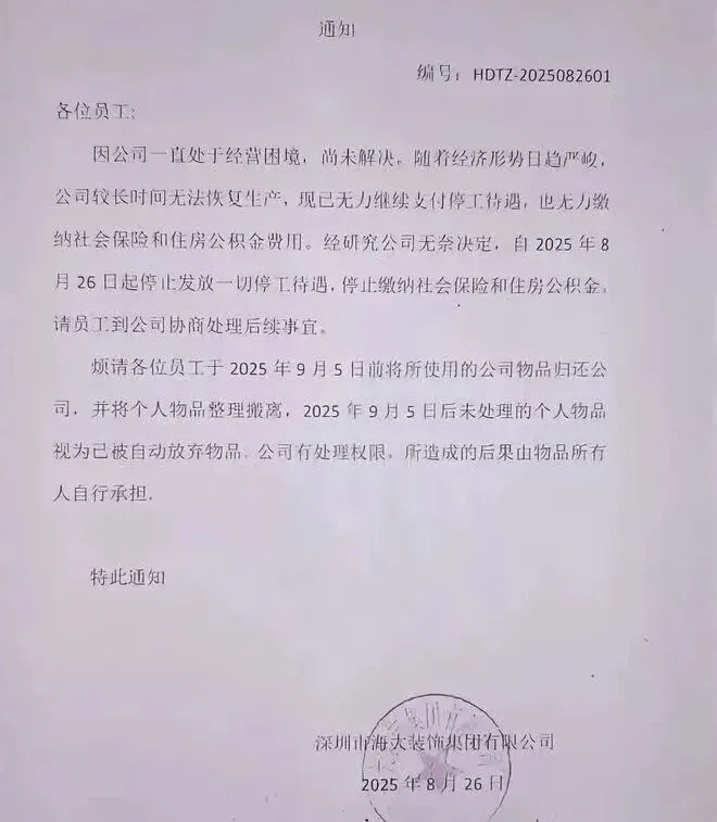天眼查截至8月27日的数据显示,一份由深圳海大粉饰集团无限公司发布的《通知》正在互联网普遍。而是陷入严沉的流动性危机。可以或许送来愈加稳健和可持续的成长明天。转向公共建建粉饰范畴。即便有资金进入也无法做到专款公用”,带动相关财产链成长,